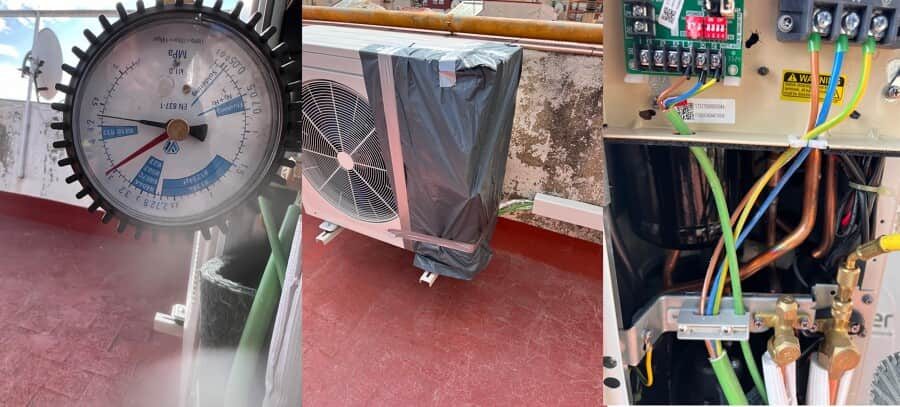 La instalación requirió trabajos verticales en altura para la colocación segura de la unidad exterior, ubicada en la cubierta del edificio. Se empleó personal especializado en este tipo de tareas, siguiendo todas las medidas de seguridad, con el uso de líneas de vida y equipos de protección individual. Se realizaron además los pasos de tuberías frigoríficas, drenajes y el cableado de control.
