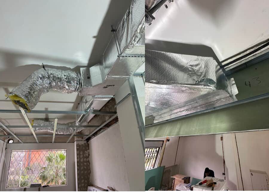Los conductos se fabricaron en fibra URSA AIR, dimensionados específicamente para cada zona, con aislamiento térmico y acústico según normativa. Cada una de las dos zonas independientes cuenta con su propia unidad interior y compuerta motorizada, controladas mediante termostatos y sensores autónomos que permiten una regulación precisa del confort.